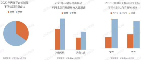 而最有趣的是区别于传统中男性喜食卤味的印象,CBNData统计的数据显示女性在性别消费占比、消费规模、人均购买力和人数增速方面均远超男性,看来美食鉴赏力和购买力都与日俱增的女性消费群体正在宣告卤味零食市场的绝对统治力,展现出真正的“她力量”。