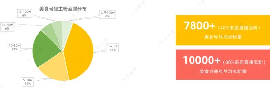 从粉丝体量分布来看,6成美食号集中在中腰部,尤其是品牌自播号月平均涨粉数超过1w,其中近8成粉丝来自直播涨粉,可见美食品牌开设自播号对于用户的拉新、转化、沉淀有较大的帮助。