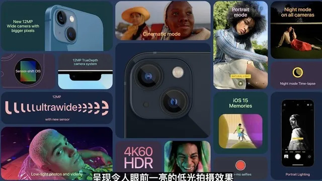 在苹果浓墨重彩的影像系统环节,Tim Cook骄傲宣称:“突破了智能手机创新的极限。” iPhone 13 系列采用全新的“强大的摄像头”、下一代 ISP,拥有“最先进的双摄像头系统”。采用了后置双 1200 万双摄规格,主摄 1200 万像素,进光量提升 47%。iPhone 13 Pro系列也采用了全新的超广角摄像头支持配备更大的F/1.8光圈,全新的77mm长焦摄像头支持3倍光学变焦,并且支持了长焦镜头的夜景拍摄。新的广角摄像头采用更大的1.9微米的传感器,拥有更大的F/1.5光圈,在低光拍摄时进光量提升最高可达2.2倍。