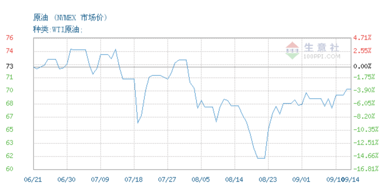 报告公布之后,油价进一步受到提振。9月14日,WTI原油、布伦特原油现货分别报70.45美元/桶、73.09美元/桶,较前一日分别上涨1.05%、0.36%。