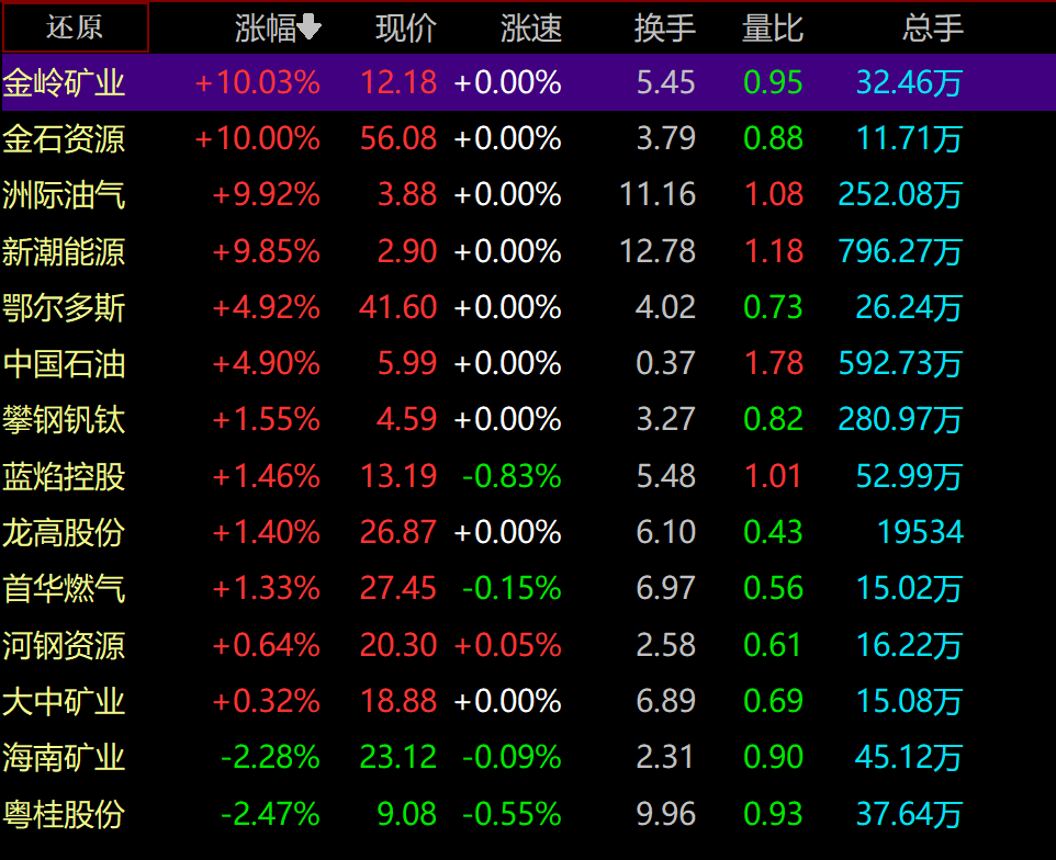 9月15日,金岭矿业(000655.SH)、金石资源(603505.SH)、洲际油气(600759.SH)、新潮能源(600777.SH)涨停封板,中国石油(601857.SH)、上海石化(600688.SH)、蓝焰控股(000968.SZ)等继续走高。