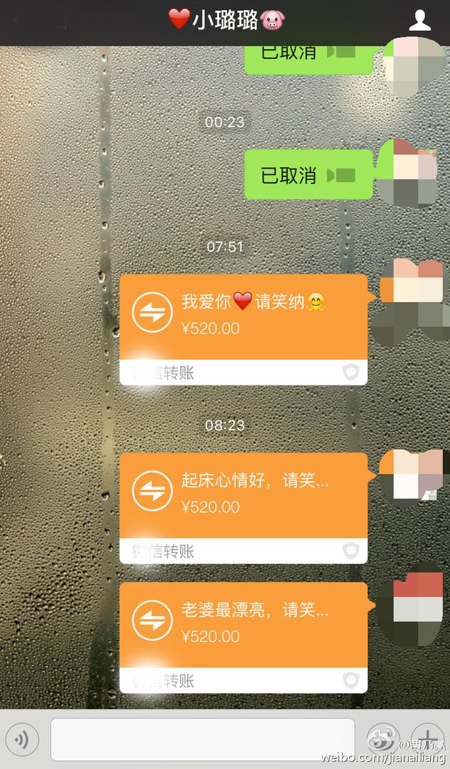 贾乃亮发微博晒出与老婆李小璐微信聊天截图,自己发出三个520红包,并声称“做老公得会来事儿”。