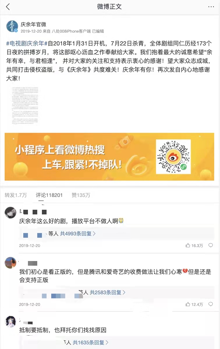 在初期,出于保护优秀作品、尊重主创心血的初心,对于传播《庆余年》盗版的行为,网友一直是抨击的。但是,腾讯和爱奇艺此举以后,传看盗版反而很吊诡地被冠以“侠义”色彩——“看盗版是为了抵制平台的割韭菜行为”。一时间,盗版更加猖獗,《庆余年》的盗播链竟将近四万条。究其根本,很多观众为了看剧已经购买了VIP,超前点播这种二次消费让本支持正版的网友觉得不受尊重。盗版频发之后,《庆余年》也迅速哑火,毕竟结局早早泄漏,看剧的热情也被平台方给熄灭。本想靠超前点播获得更高收益的平台,没有想到网友会用这样的行动抗议。