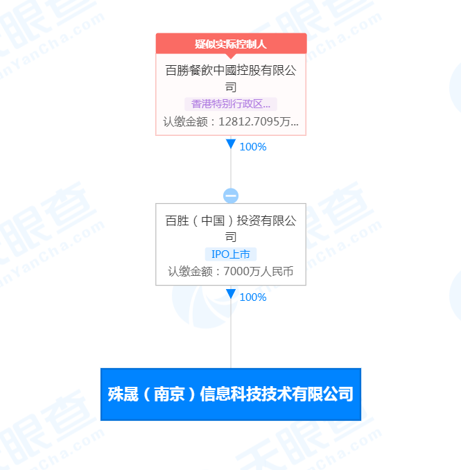 据天眼查APP显示,9月15日,殊晟(南京)信息科技技术有限公司成立,法定代表人为黄华刚,注册资本7000万人民币,经营范围包括大数据服务;人工智能应用软件开发;信息系统集成服务;电子产品销售等。股权穿透图显示,该公司由百胜餐饮中国控股有限公司间接全资控股。