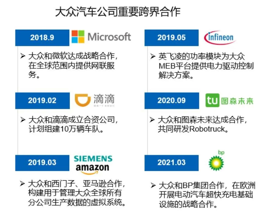 另外,在加大研发投入的同时,大众近年来还以投资、收购的方式入股了Northvolt、Argo AI、Hella Aglaia等企业,在自动驾驶、人工智能和新能源汽车等领域“大规模扩张”。同时,大众还与滴滴、微软、亚马逊等互联网头部企业跨界合作,加速转型为“软件驱动型移动出行服务供应商”。