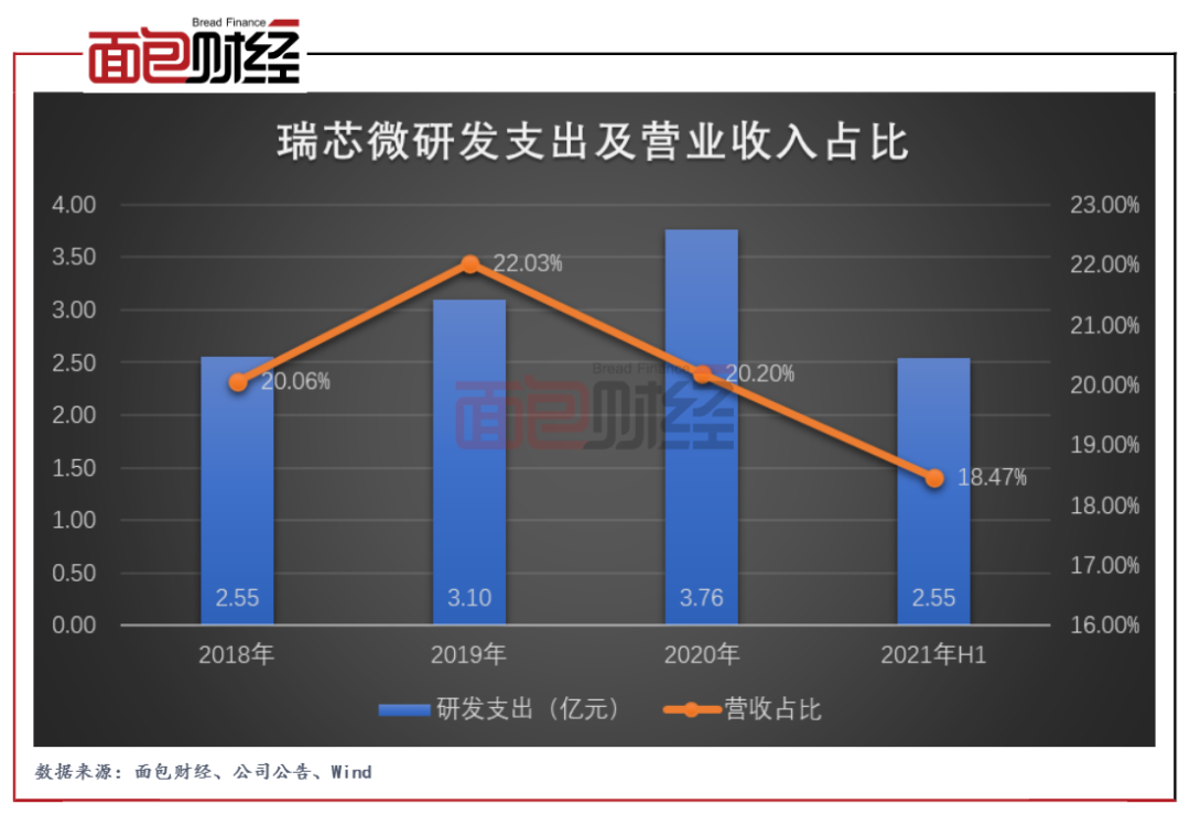 2021年上半年,瑞芯微的研发支出金额为2.55亿元,同比增长59.69%,占同期营业收入的比例为18.47%。在A股所有78家上市半导体企业中,瑞芯微今年上半年的研发支出金额以及研发支出占营业收入的比例均排在前20名。