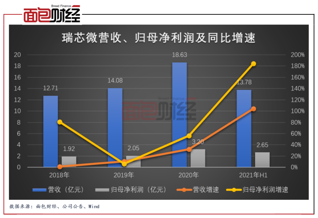 查阅最近三年的业绩表现,瑞芯微2019年业绩增长较慢,当年营收、归母净利润分别仅同比增长10.77%和6.53%;到了2020年,公司业绩加速增长,当年实现营收18.63亿元、归母净利润3.2亿元,同比分别增长32.37%和56.31%。