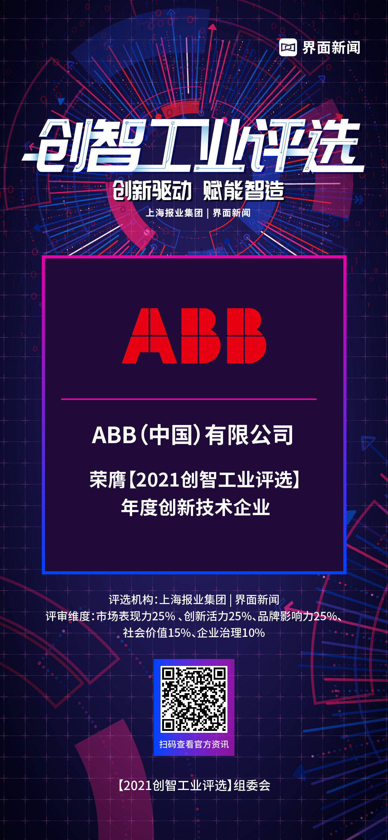 9月16日,上海报业集团|界面新闻在上海虹桥康得思酒店举办了2021【创智工业评选】颁奖典礼。国内政商学界领袖与制造业专家强大阵容集结,聚焦数字化时代的产业升级与变化,共同探讨“碳中和”时代工业企业转型的机遇与挑战。ABB(中国)有限公司凭借其始终如一的科技创新理念,荣膺年度创新技术企业奖。