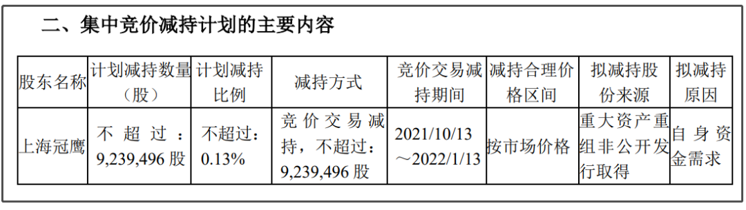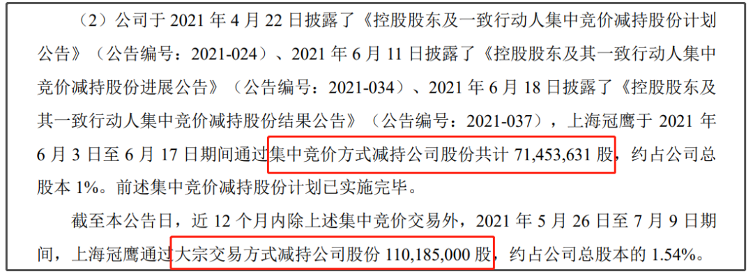截至2020年末,上海冠鹰持有公司股份1.91亿股,是公司第四大股东,所持股份均为限售股。自今年3月份限售股解禁以来,上海冠鹰共减持公司股份近1.82亿股。其中5月26日至7月9日期间,上海冠鹰通过大宗交易方式减持公司股份1.1亿股,约占公司总股本的1.54%;6月3日至6月17日期间通过集中竞价方式减持公司股份7145.36万股,约占公司总股本1%。