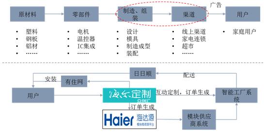 图为:传统工业时代的家电产业链及海尔集团的新型生态系统