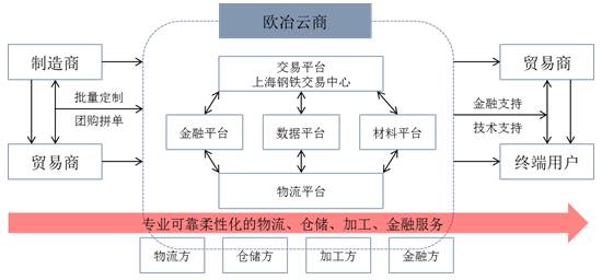 关于云商平台方面,宝钢集团通过欧冶云商的综合服务平台,整合集团内外相关的电商平台、剪切加工体系、金融服务平台等优势资源,打造信息平台+综合物流+金融服务三网融合的钢铁供应链闭环生态圈。