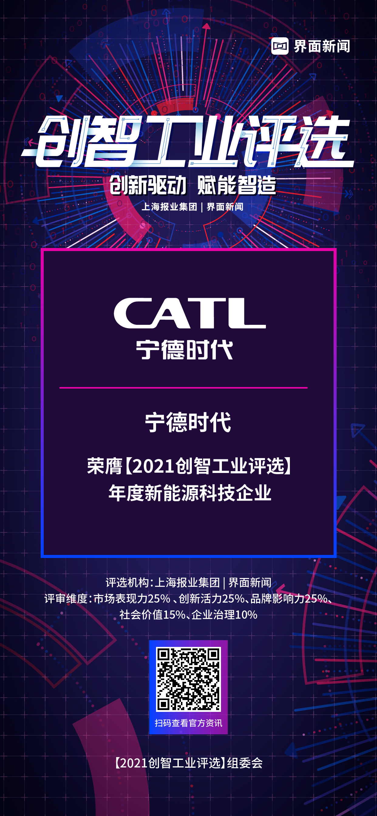9月16日,上海报业集团|界面新闻在上海虹桥康得思酒店举办了2021【创智工业评选】颁奖典礼。国内政商学界领袖与制造业专家强大阵容集结,聚焦数字化时代的产业升级与变化,共同探讨“碳中和”时代工业企业转型的机遇与挑战。宁德时代凭借其技术硬核、规模领先、理念先进的绝对实力,荣膺年度卓越品质大奖。