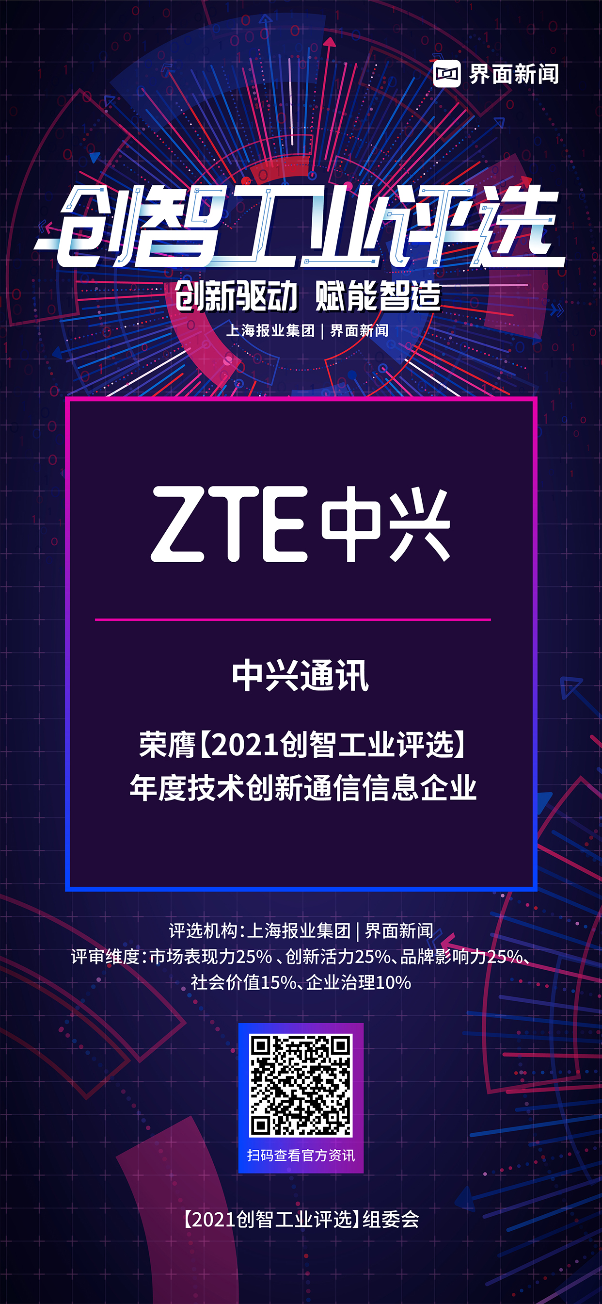 9月16日,上海报业集团|界面新闻在上海虹桥康得思酒店举办了2021【创智工业评选】颁奖典礼。国内政商学界领袖与制造业专家强大阵容集结,聚焦数字化时代的产业升级与变化,共同探讨“碳中和”时代工业企业转型的机遇与挑战。中兴通讯作为全球领先的综合通信信息解决方案提供商,凭借其“创新、融合、绿色”理念,荣膺年度技术创新通信信息企业。