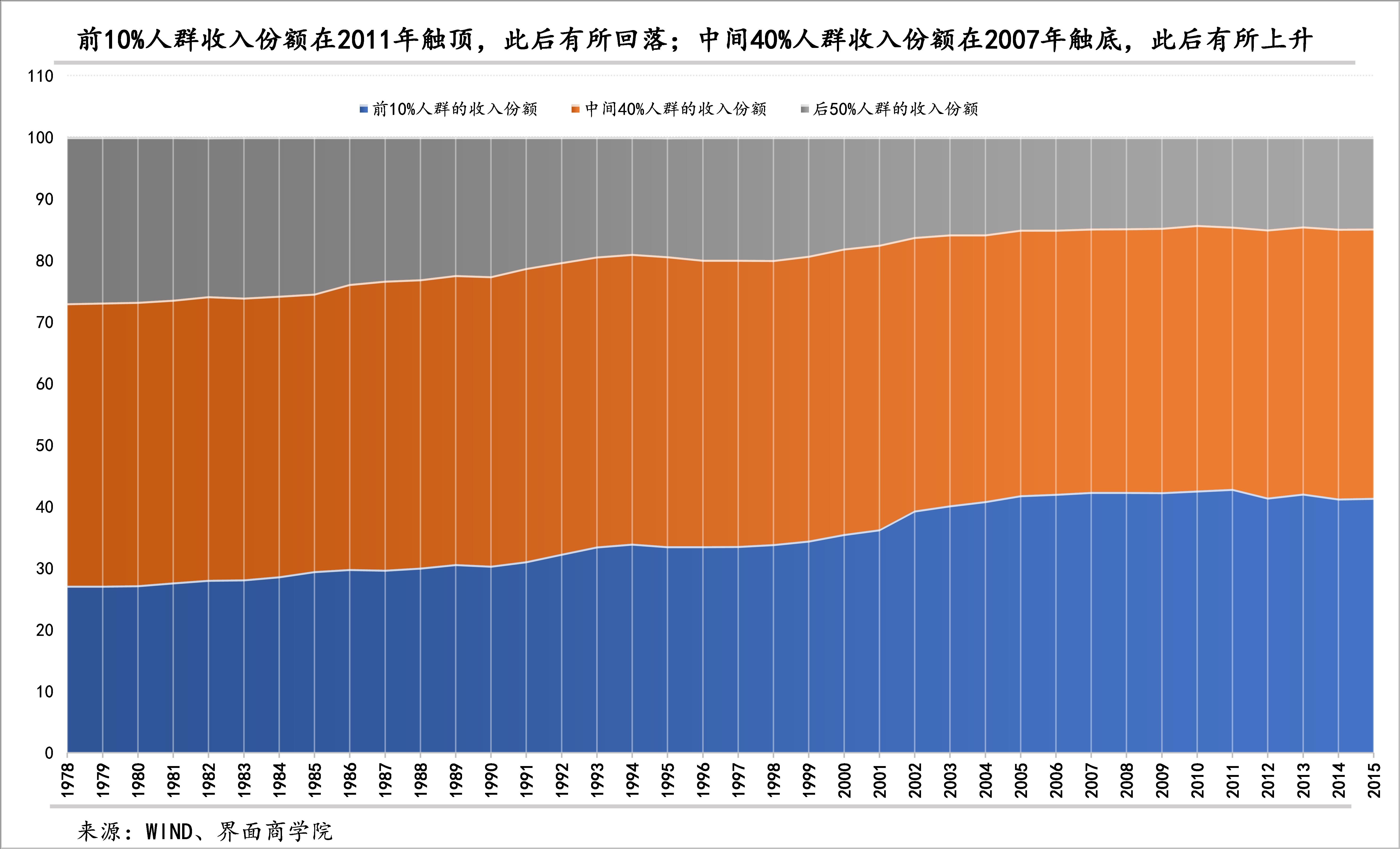 纵向来看,我国收入不平等问题有所改善。WID历史数据显示,中国前1%人群的收入份额在2009年触顶后回落,前10%人群收入份额在2011年触顶后也有所回落,中间40%人群的收入份额在2007年触底后有所上升,后50%人群收入份额在2010年触底后在波动中有所上升。