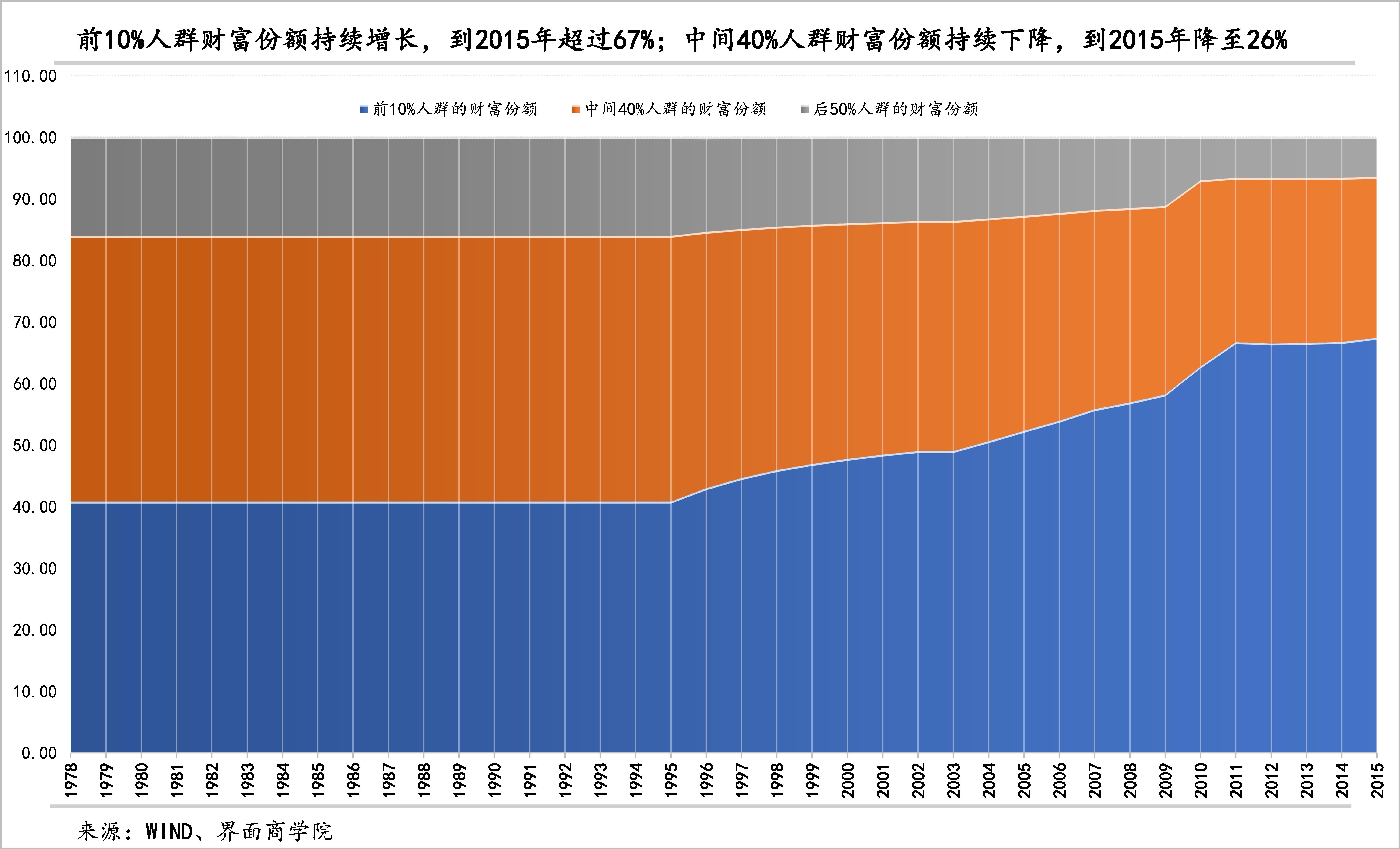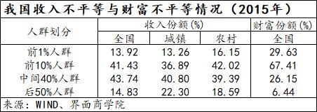 3、我国财富不平等问题比收入更为严重。WID最新发布的截至2015年的各国财富分布数据显示,我国前1%人群占有的财富份额达到近三成,前10%人群占有的财富份额超过67%,中间40%人群的财富份额仅为26.2%,后50%人群的财富份额只有6.4%。