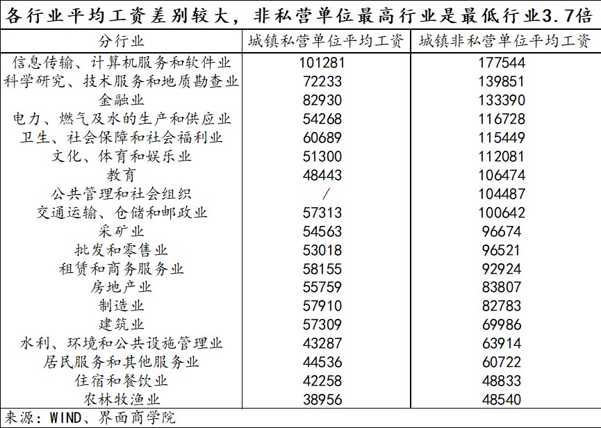 城镇地区非私营单位包括国有单位、城镇集体单位、联营、股份制、外商投资、港澳台商投资等单位。城镇地区私营单位包括私营有限责任公司、私营股份有限公司、私营合伙企业和私营独资企业。上述平均工资=报告期实际支付的全部就业人员工资总额/报告期全部就业人员平均人数。2019年,全国私营企业就业人数为22833万人,其中,城镇私营企业就业人数为14566万人;城镇非私营单位就业人数则为17162万人(非私营单位各行业就业人数合计)。