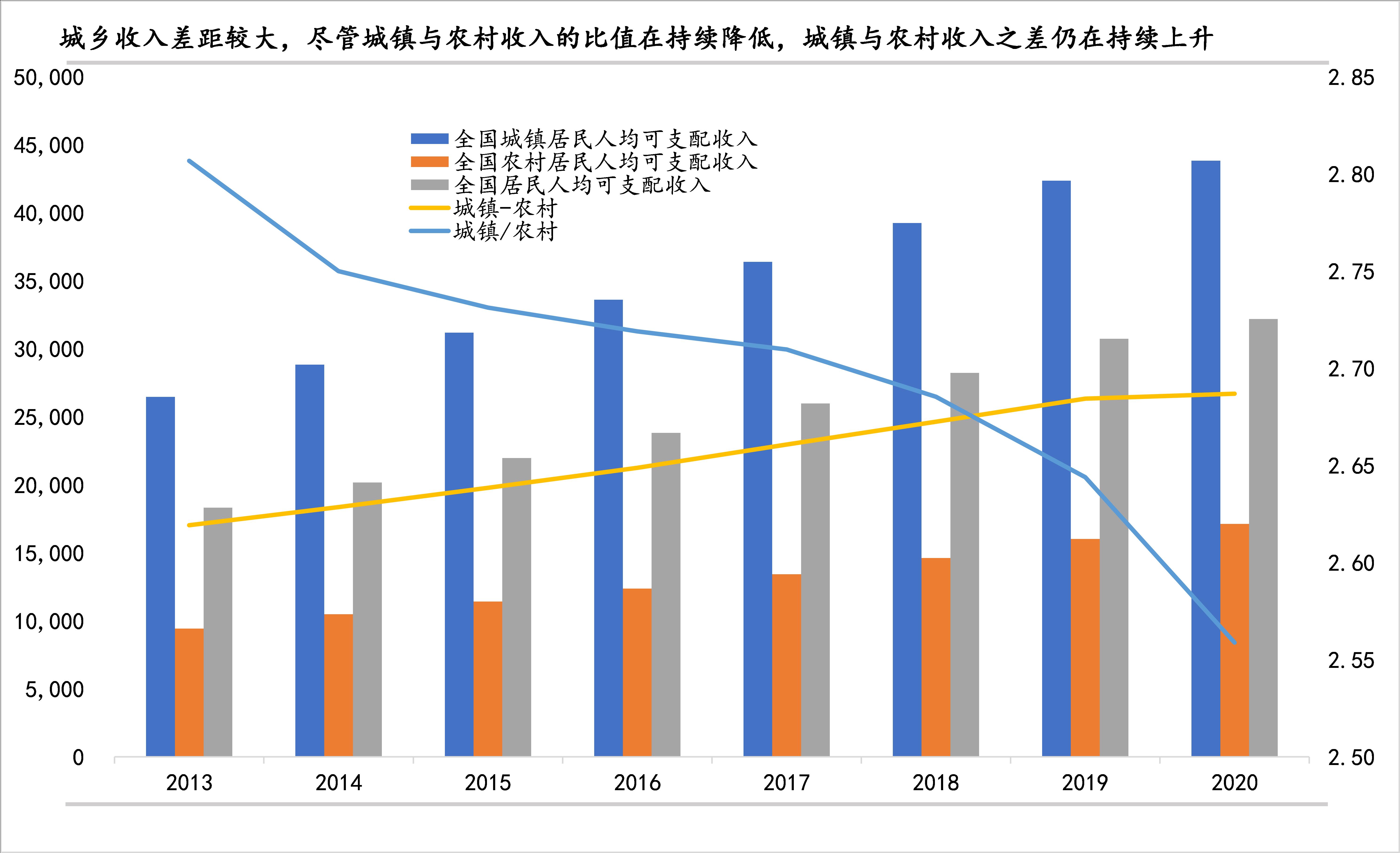 4、我国城乡之间收入差距依然较大。虽然近年农村收入增长的速度快于城镇,城镇与农村人均可支配收入的比值持续减小,但因为基数问题,城镇与农村人均可支配收入的差值仍在持续上升。到2020年,城镇居民人均可支配收入为43834元,农村居民人均可支配收入为17131元,二者相差32189元,前者是后者的2.56倍。