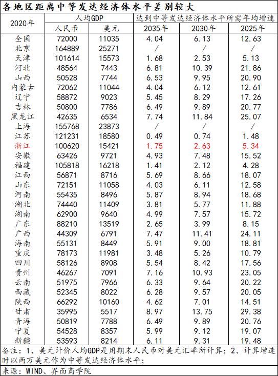 如果以2万美元作为中等发达经济体人均GDP水平,有的已经达到中等发达经济体水平,如北京、上海;有的相去甚远,人均地区生产总值年增长速度超过7.5%才可能在2035年达到,如甘肃、黑龙江、广西;有的已经非常接近,预计五年之内即可达到,如江苏、福建、浙江。