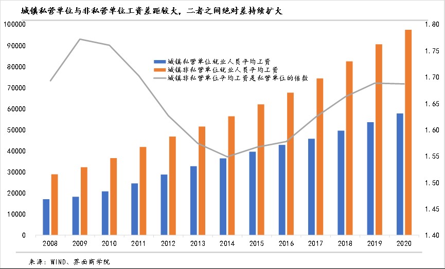 7、私营单位和非私营单位之间工资差距较大,并且近年有所恶化。2020年,城镇非私营单位平均工资为97379元,城镇私营单位平均工资为57727元,前者是后者1.69倍,二者相差近4万元。