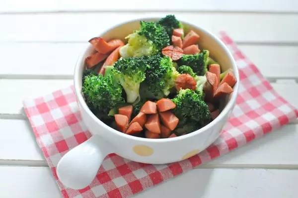 热锅加油,放入脆皮肠炒至“开花”,再加入西兰花翻炒,放入适量盐和酱油调味即可。