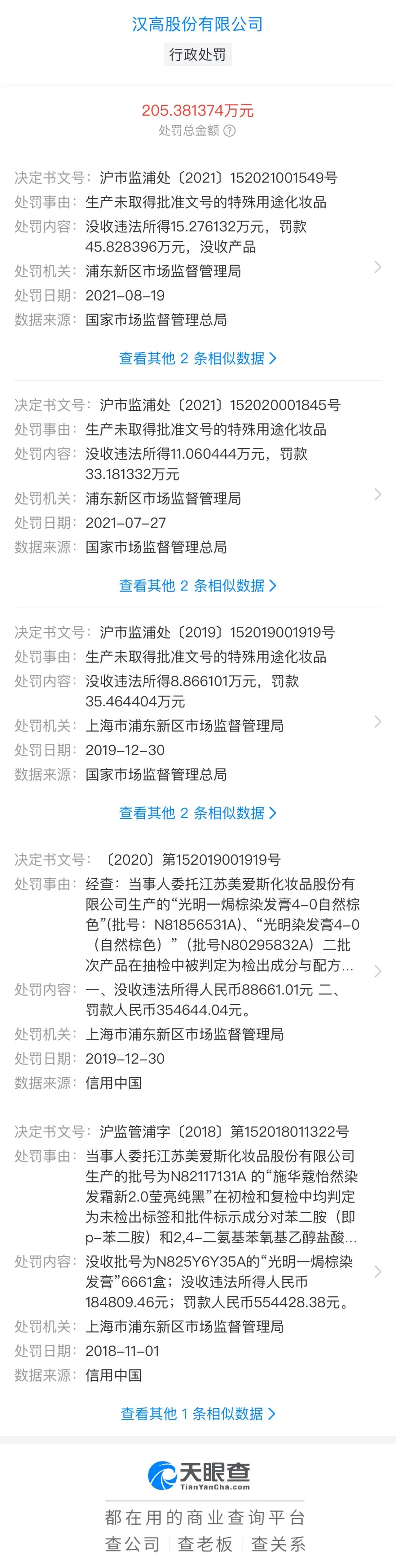 另外,根据天眼查显示,2018年至今,汉高目前累计共有5条行政处罚记录,罚款总金额高达约205万元。据公开资料显示,汉高股份有限公司已备案在册生产的产品有施华蔻、丝蕴、光明等化妆品品牌。