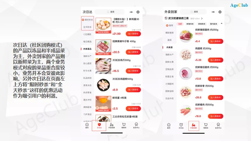 两种模式对应的菜品类型也不相同,外卖的产品以新鲜菜为主,主要满足对菜品品质要求较高,又不愿出门的中老年用户需求,自提的产品则以低价、标品为主,不少是冻品和半成品菜,满足中老年用户占便宜的心理。