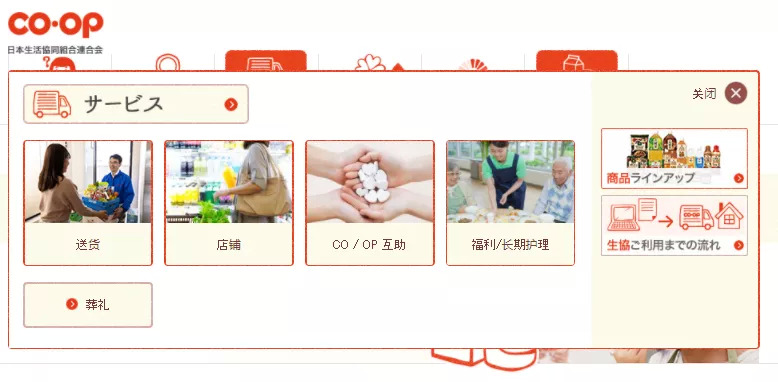 在这个过程中,由于日本单身经济和老龄经济的到来,生协逐渐成为一个包含共同购买(即团购)业务在内,多种生活服务并存的组织,根据生协官网,该组织以门店为站点,提供送货上门、医疗保险等互助业务、老年人看护以及丧葬业务等等。