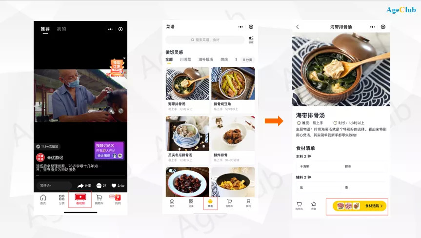 美团优选则增加了“菜谱”板块,点开想做的菜谱,里面会有详细的菜谱教程,同时会推荐选购食材,为用户提供一站式做菜解决方案。