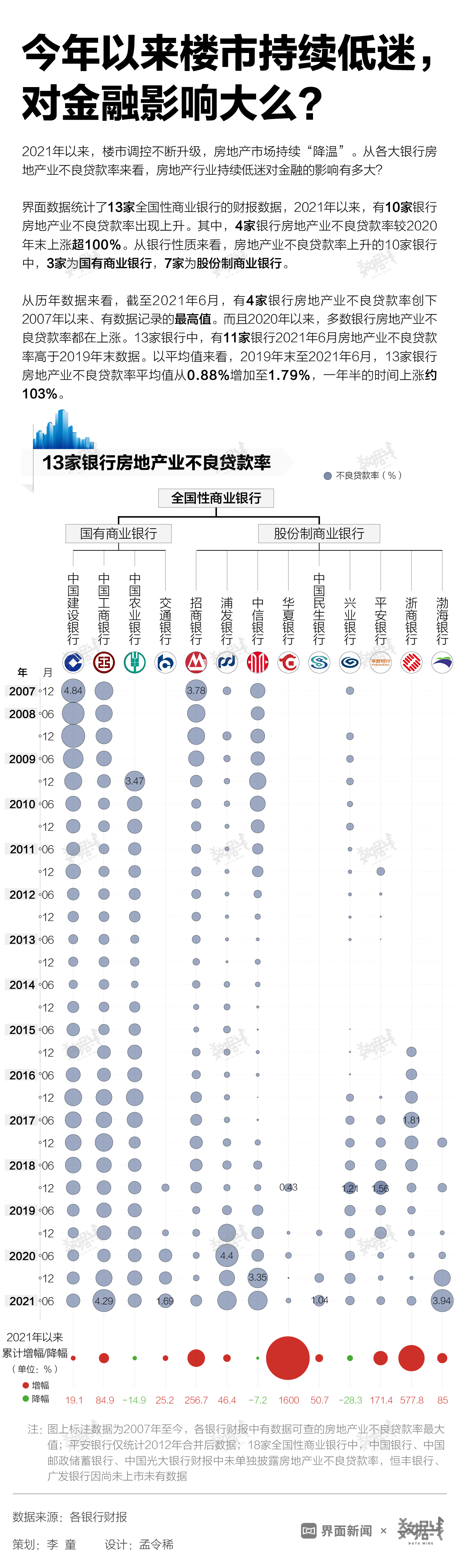 2021年以来,有10家全国性商业银行房地产业不良贷款率出现上升。其中,4家银行房地产业不良贷款率较2020年末上涨超100%。