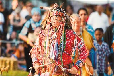 2013年7月27日,一名身着传统装束的印第安人在美国纽约举行的“帕瓦仪式”上表演舞蹈。新华社记者 王 雷摄