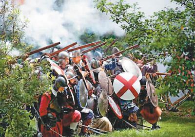 2007年5月11日,在美国弗吉尼亚州詹姆斯敦殖民定居点旧址,一些全副武装的演员正在重现当年殖民者士兵与印第安人战斗的场景。新华社记者 侯 俊摄