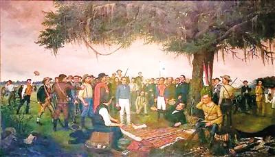 1836年圣哈辛托战役墨西哥战败,墨西哥总统桑塔·安纳向受伤的美军统帅塞缪尔·休斯顿投降的一幕。此战后,墨西哥再也无力阻止得克萨斯独立为共和国。因美国国内政治问题,9年后的1845年,得克萨斯才正式并入美利坚合众国。图为威廉·亨利·哈德尔的画作《桑塔·安纳投降》。(来源:国家人文历史)