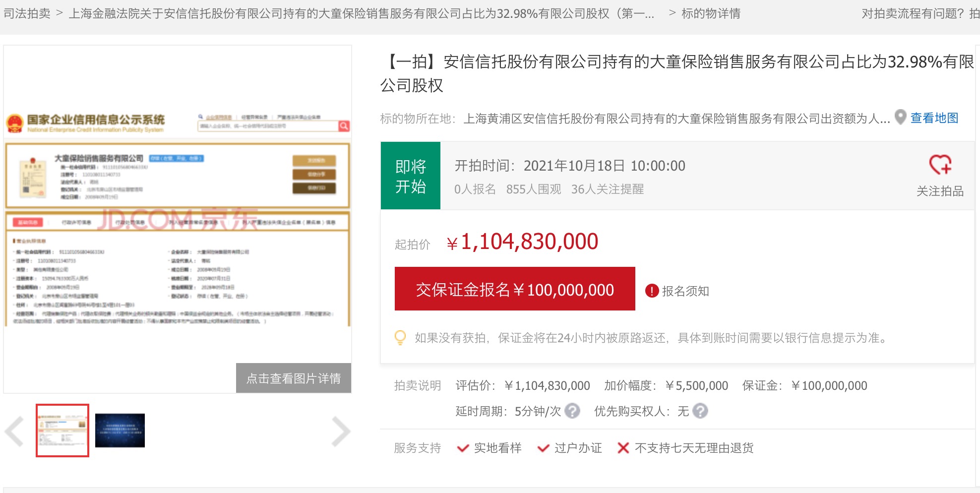 经界面新闻记者查询,上述拍卖标的已在京东网上挂出,涉及安信信托在大童保险中持有的全部股权(安信信托出资额4978.1344万元,股权占比32.9792%),对应起拍价为11.0483亿元,保证金1亿元,增价幅度550万元及其倍数。