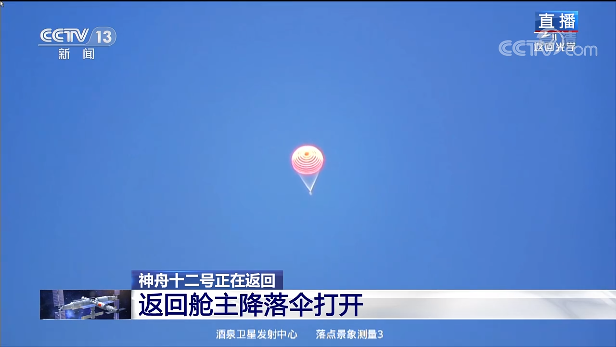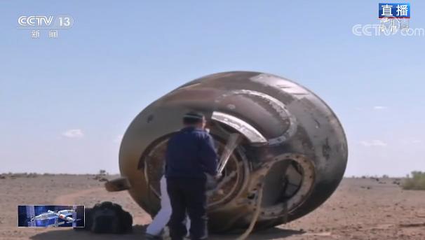 返回舱乘伞降落,距离地面6公里左右,返回舱抛防热大底。