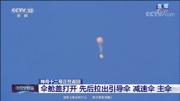 伞舱盖打开,先后拉出引导伞、减速伞、主伞。