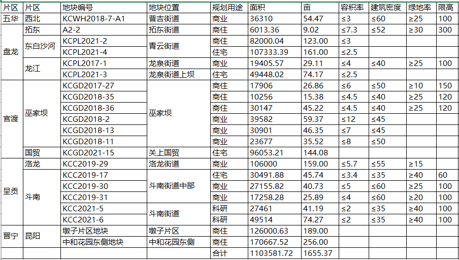 从7月中旬昆明市举办的2021年储备土地推介会来看,接下来五华、盘龙、官渡、呈贡及晋宁五区,还有共计21宗约1654.9亩优质土地入市。