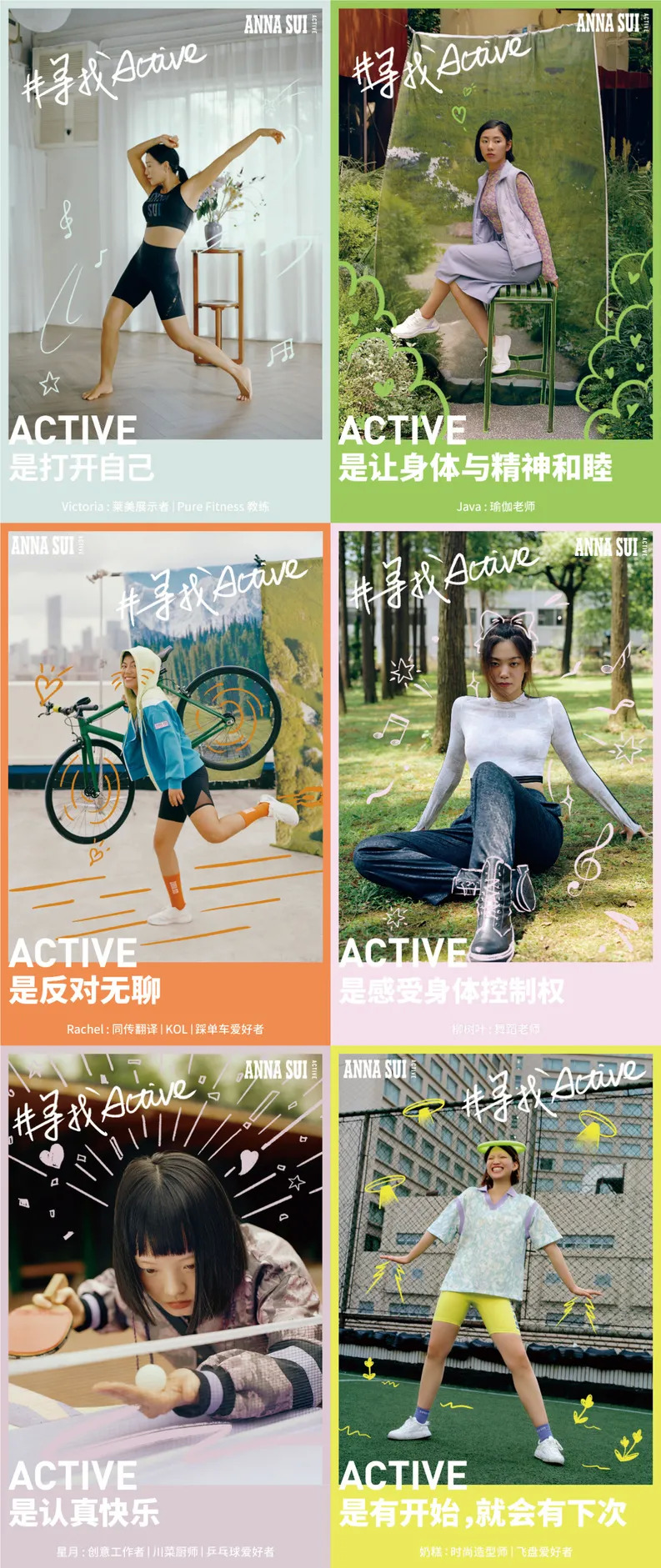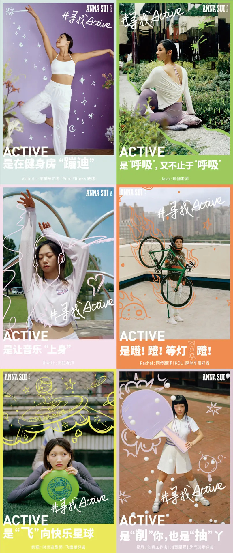 在这次的企划中,Anna Sui Active特别邀请了6位不同领域的ASA GIRLS来做分享。她们有从事同传翻译的自行车爱好者,也有会做川菜的乒乓球爱好者,也有接近40岁却仍然活力四射的运动教练,她们每个人都分享了自己的Active故事与经历。