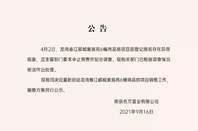 昨日南京龙湖官方公众号就已发布消息称,项目紫宸苑6幢即将重新启动销售。本次加推58套带装修房源,户型建面约118、124、127㎡,首付8成,验资295万。