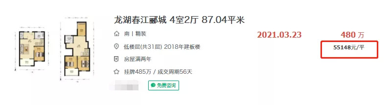 二手房方面,据链家网显示,目前小区的二手房挂牌均价为46306元/㎡,共计有58套房源在售;而今年小区最高成交价为3月底的一套87.04㎡小户型,成交价为55148元/㎡,突破5.5万/㎡的大关。同小区一二手房价倒挂约1.3万/㎡。