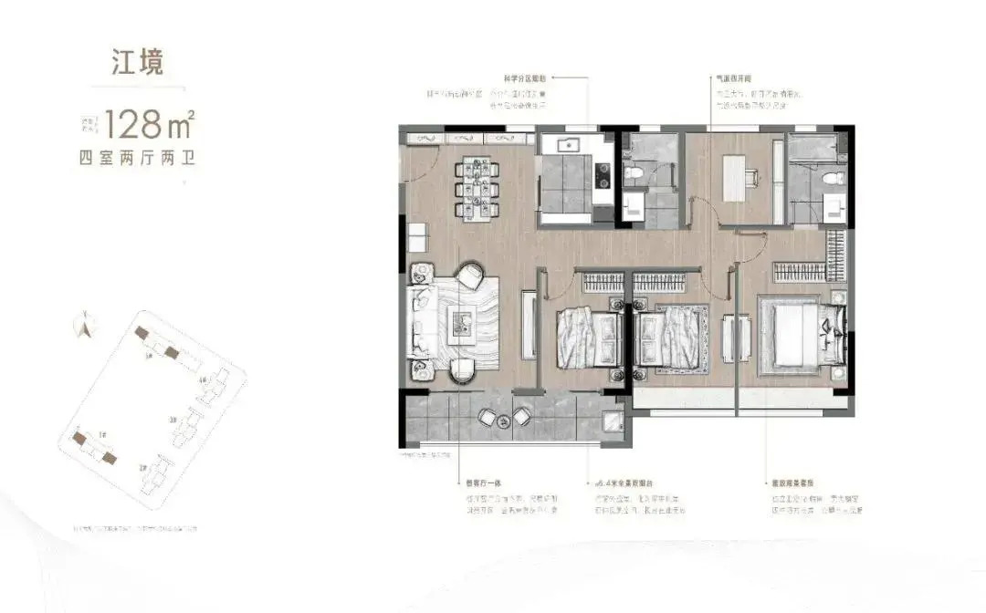 项目共规划有5栋楼,建筑面积约128、143㎡,共400多套房源,计划分2次推完。其中升级装修三大件为日立中央空调、菲斯曼(或威能或博世)地暖、兰舍新风,目前升级包价格待定。