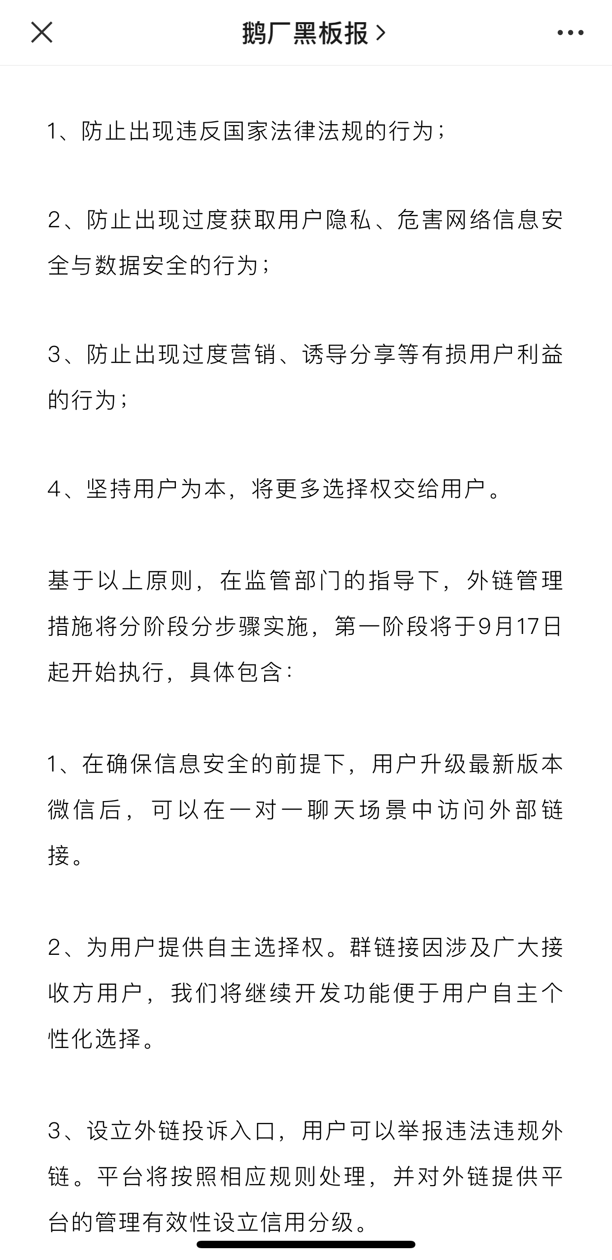 正当有人质疑微信何时按要求解除屏蔽时,微信发布公告,以用户体验、安全底线为理由,制定出外链开放原则: