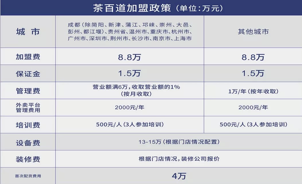 官网显示,加盟茶百道需要缴纳8.8万的加盟费和1.5万的保证金,成都、贵州、温州、重庆、杭州、广州、深圳、荆州、长沙、南京、上海等城市和其他城市抽取的管理费不一样,从加盟费用来看,除去装修费、门店租金和人工成本,加盟一家茶百道需要近30万元。