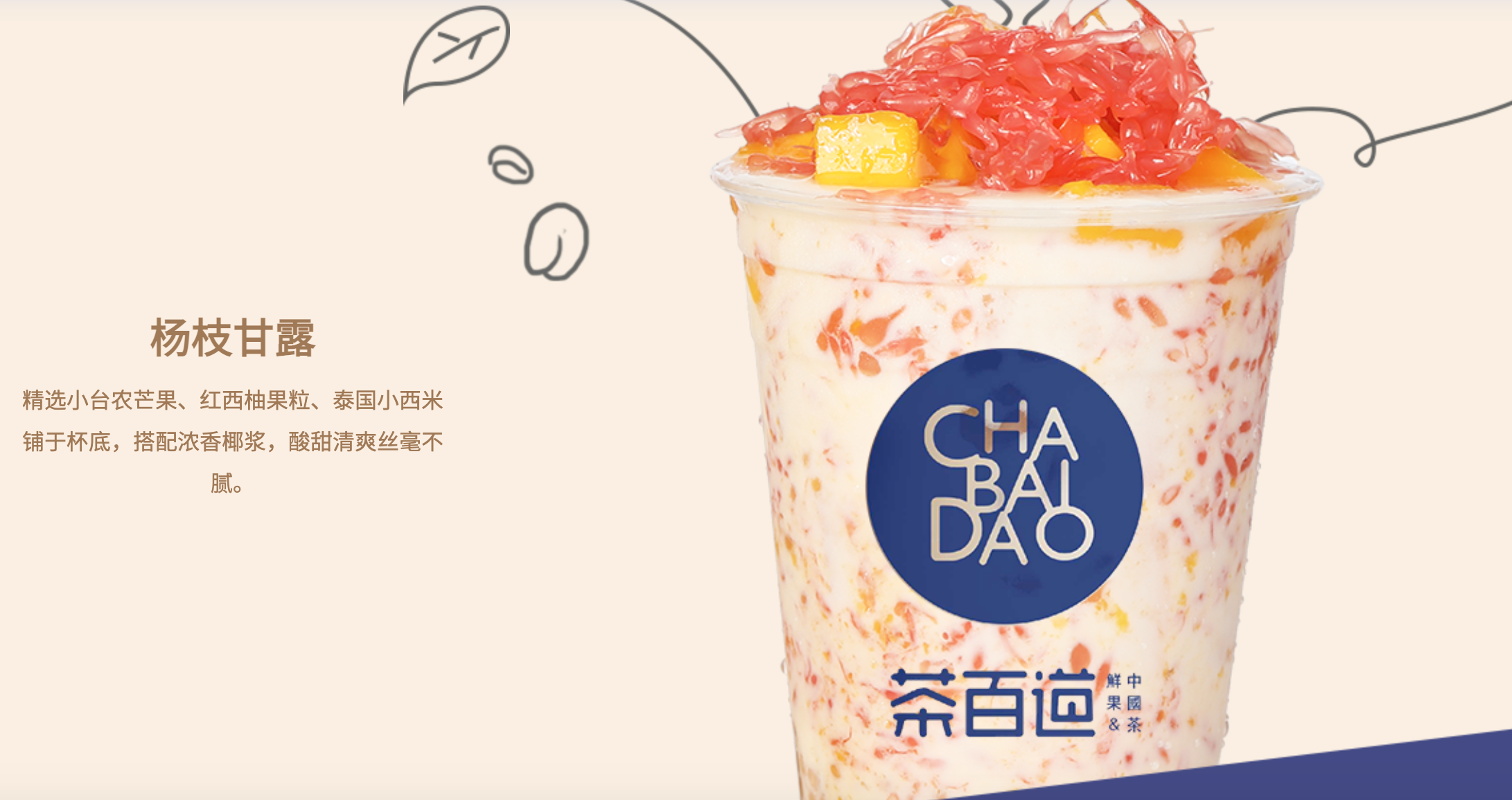 茶百道创立于2008年,第一家门店开在四川成都温江二中附近,以学生作为目标人群。产品主打鲜果茶与奶茶,招牌产品有杨枝甘露、豆乳玉麒麟、超级杯水果茶等,价格区间在8-23元区间,定位中低端。