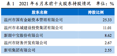 截至2021年6月末,温州银行股本总额为66.92亿元,前十大股东合计持股61.19%,温州银行目前无控股股东和实际控制人。