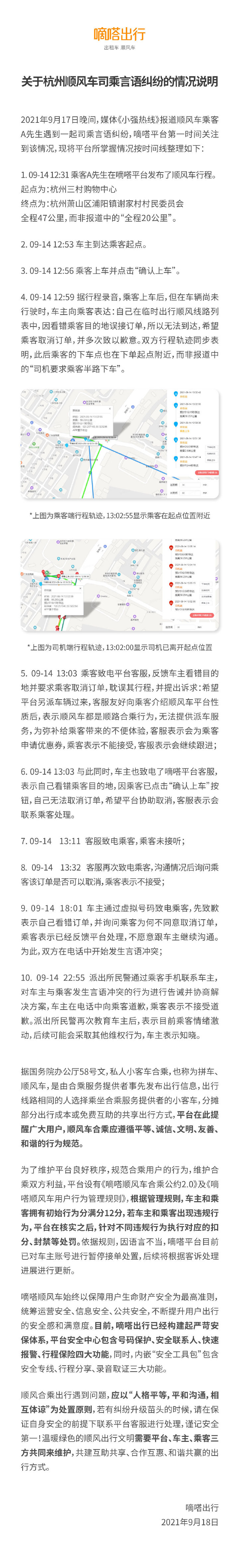 9月18日,@嘀嗒出行 就此前有媒体报道司机半路赶乘客下车并进行恐吓辱骂一事发布情况说明称,据行程录音,乘客上车后,但在车辆尚未行驶时,车主向乘客表示自己因看错乘客目的地误接订单,所以无法到达,希望乘客取消订单,并多次致以歉意,双方行程轨迹同步表明,非报道中的“司机要求乘客半路下车”。