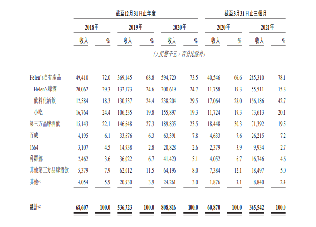 从收入占比来看,海伦司自有品牌产品的收入贡献占比在过去三年里呈现小幅波动,2018年—2020年分别录得72%、68.8%和73.5%。2021年第一季度该比例小幅度攀升,至78.1%。值得注意的是,如果细分看自有产品,名为“饮料化酒饮”的占比从去年同期的28%大幅攀升至42.7%,海伦司自有品牌啤酒(15.3%)的贡献不及小吃(20.1%)。