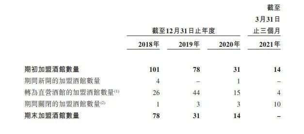 海伦司会不会是一个靠加盟费支撑营收的公司呢?招股书给出的数据显示,公司近两年似乎有意在控制加盟酒馆的数量。从2018年到2020年,新加盟酒馆的数量分别录得4家、0家和1家,并且有26家、44家和15家从加盟转为直营。截至2021年第一季度,海伦司已经没有加盟酒馆数量、全部转为直营模式,该季度99.9%的收入由直营酒馆贡献。