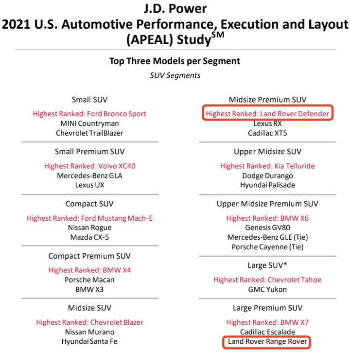 在车型单项排行上,路虎全新一代卫士位列中型豪华SUV细分市场位列榜首,超越雷克萨斯RX和凯迪拉克XT5。路虎揽胜则在大型豪华SUV细分市场为例第三,仅次于宝马X7和凯迪拉克凯雷德。