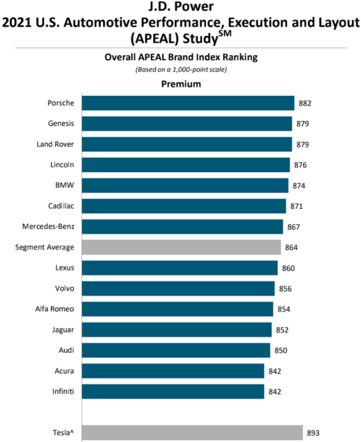 近日,美国知名市场研究和咨询、数据及分析服务提供商J.D. Power公布了2021年汽车魅力指数研究(APEAL研究)报告结果。
