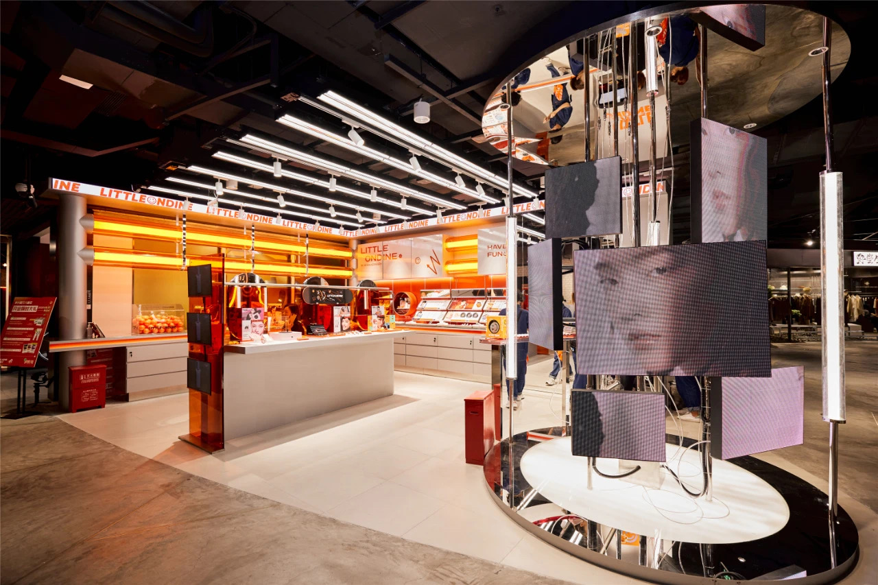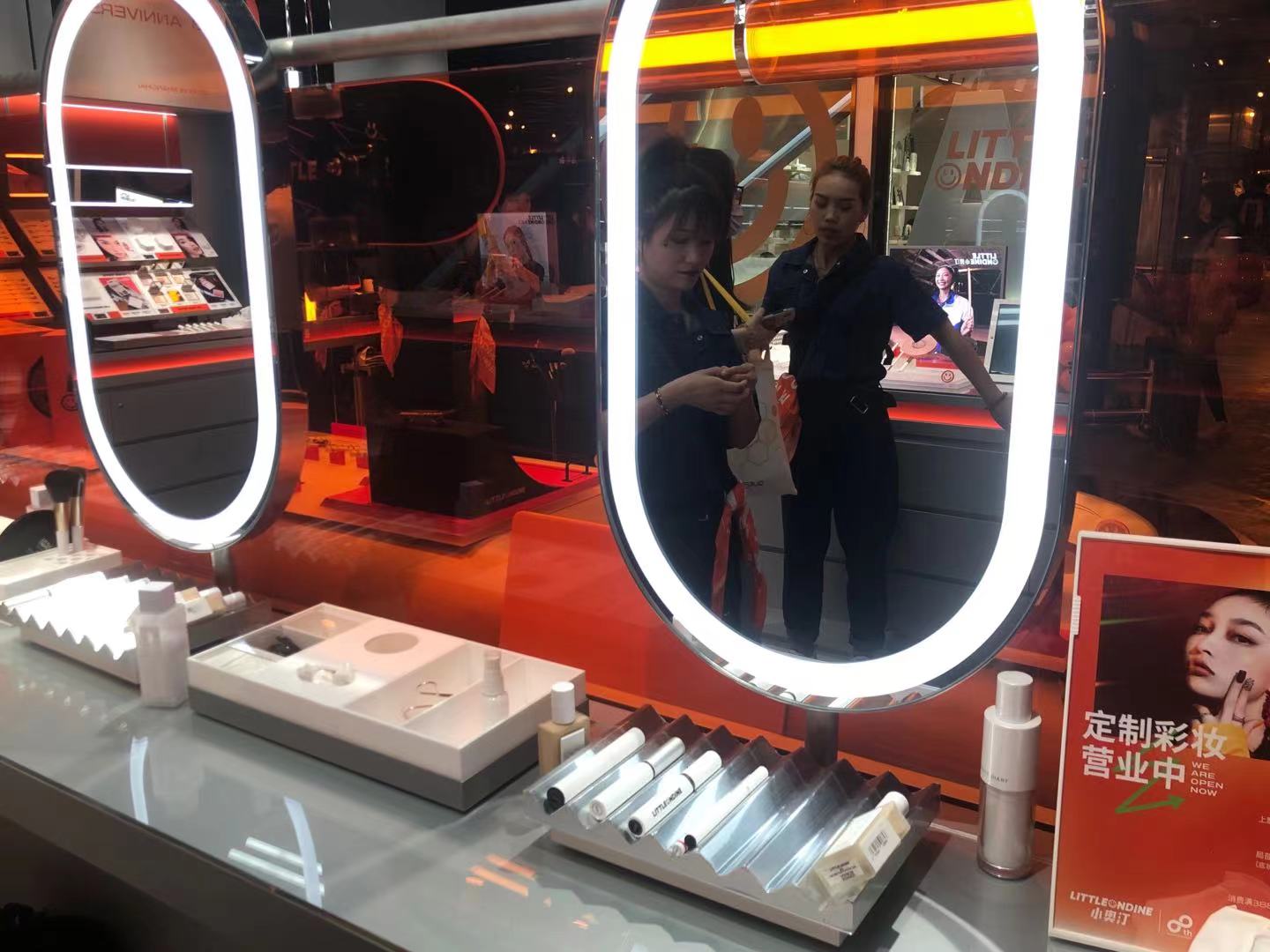 小奥汀门店呈开放式设计,整体装潢以大面积的金属和橘色为基调,同时灯光、管道、电缆的交错连结颇有科技感氛围。在店铺中央,小奥汀还设置了一块彩妆体验区,摆放了大化妆镜、卸妆棉等物品可供消费者自行化妆体验。